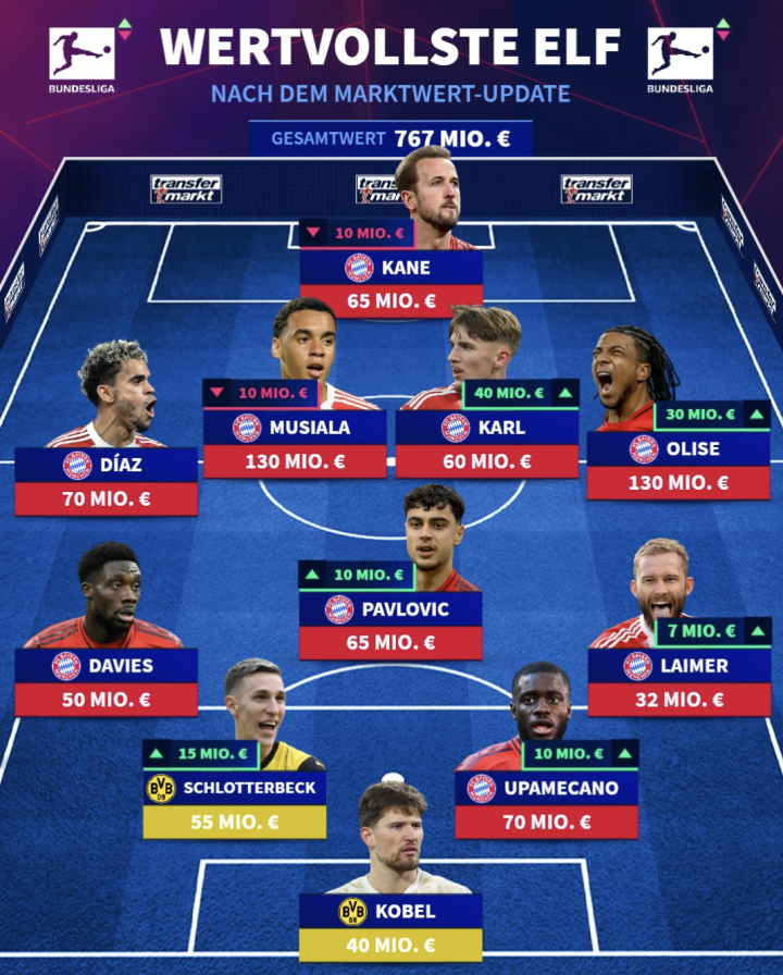 穆西亚拉和奥利塞以1.3亿领衔总价7.67亿的阵容K线猎手,其中拜仁独占9席、多特占据剩余2席。