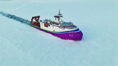 “探索三号”在北极密集冰区破冰航行。 自然资源部供图